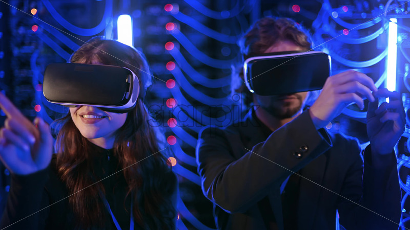 Video – Royalty free stock video A man and a woman using Virtual Reality headsets in a server room