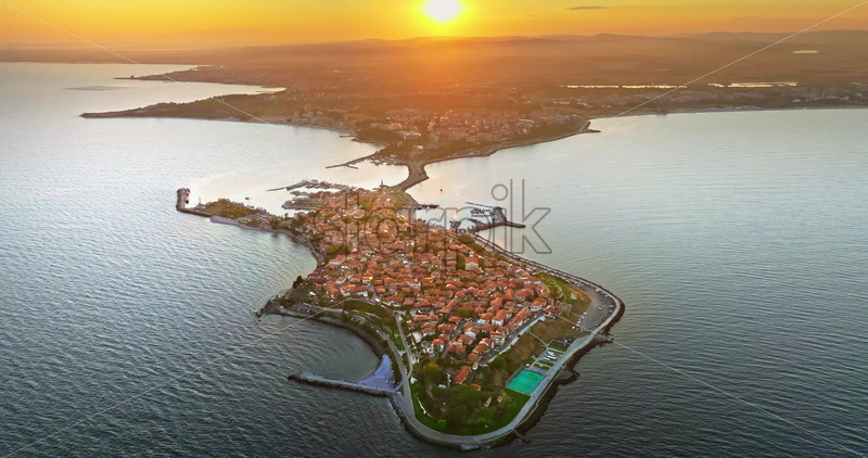 Royalty free stock footage Aerial drone view of the old town Nessebar, Bulgaria at sunset Royalty Free Stock Video Footage