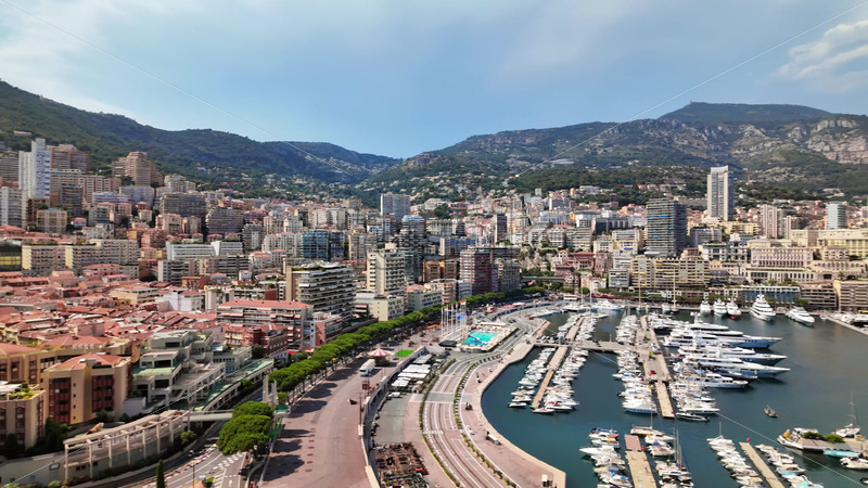 Royalty free stock video Aerial view of white boats docked in the Monaco Marina with the skyline on the background Royalty Free Stock Video Footage