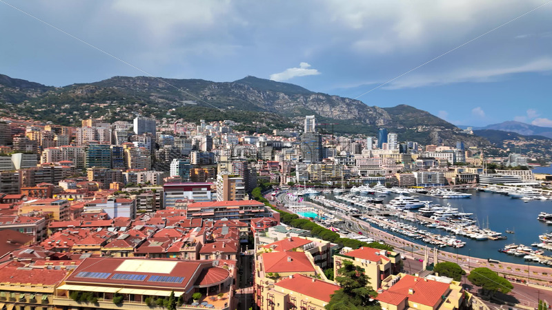 Royalty free stock video Aerial view of white boats docked in the Monaco Marina with the skyline on the background Royalty Free Stock Video Footage