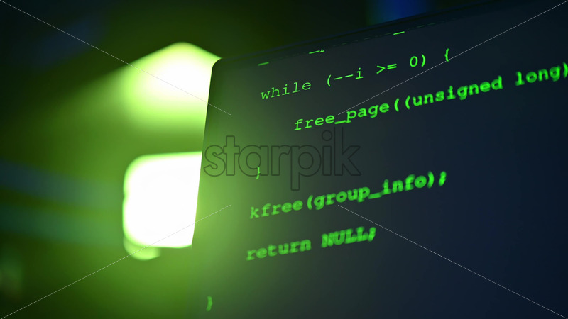 Royalty free stock video Close up of code on a screen in a server room with flashing red lights Royalty Free Stock Video Footage