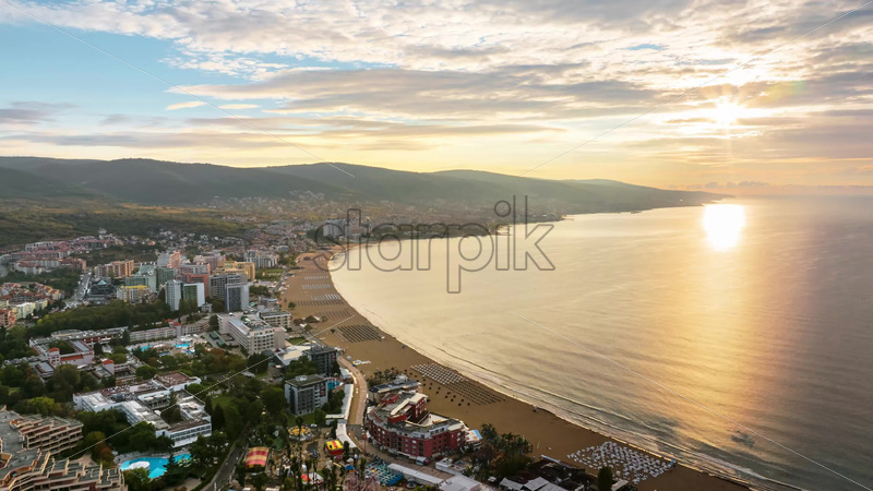 Royalty free stock footage Aerial drone view of the Sunny Beach resort in Bulgaria at sunset Royalty Free Stock Video Footage