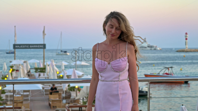 Video – Royalty free stock video Woman in pink dress posing with the beach on the background in the evening in Cannes, France