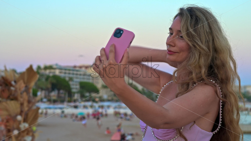 Video – Royalty free stock video Woman in pink dress taking pictures at the beach in the evening in Cannes, France