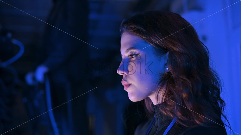 Royalty free stock video Woman programming in a server room while a man is using a Virtual Reality headset Royalty Free Stock Video Footage