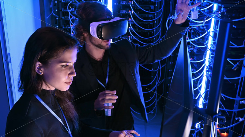 Royalty free stock video Woman programming in a server room while a man is using a Virtual Reality headset Royalty Free Stock Video Footage