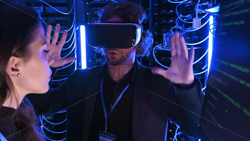 Royalty free stock video Woman programming in a server room while a man is using a Virtual Reality headset Royalty Free Stock Video Footage