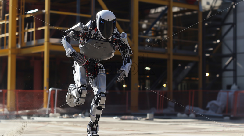 Outside a factory, a robot prototype with human features showcases its agility as it runs with impressive speed.