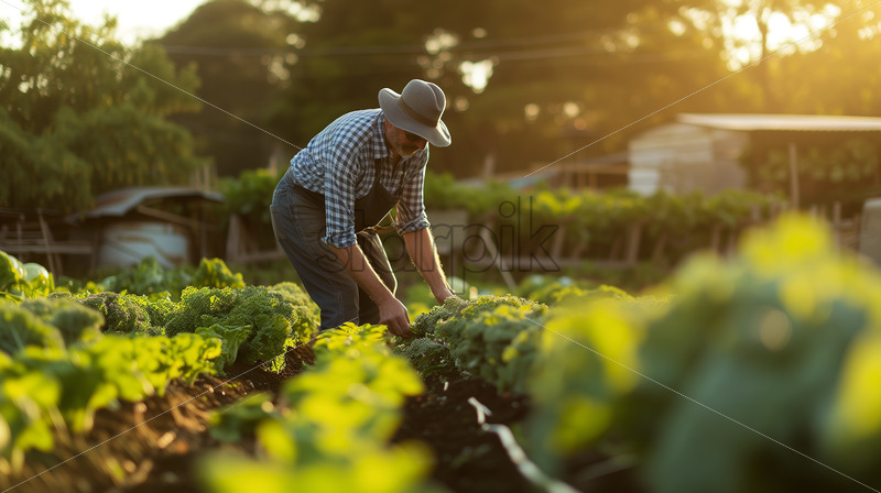 A dedicated organic farmer tending to rows of organic vegetables on a farm, embodying the ethos of the organic farming movement.