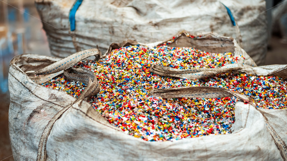 Sack of sorted multicoloured shredded plastic garbage at waste recycling factory