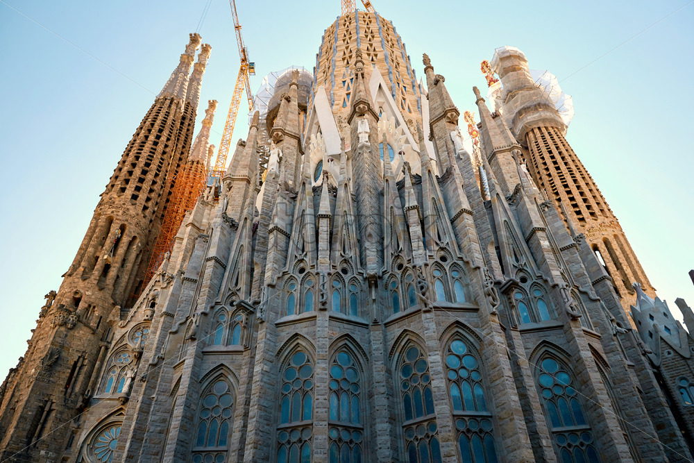 Sagrada Familia church from bottom view. Clear sunset sky, Barcelona, Spain Royalty Free Stock photo