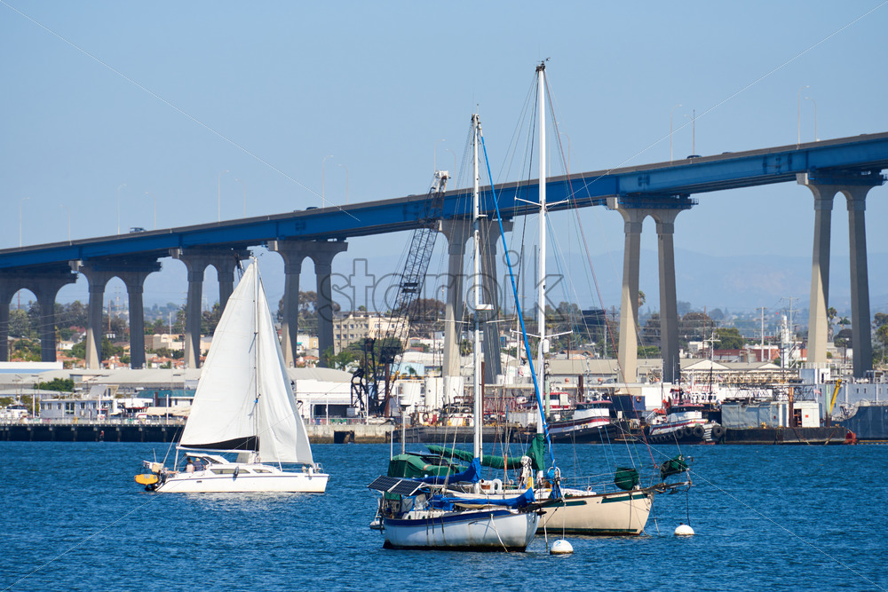 Sailing boats in waterfront area. Bridge on background. San Diego, California