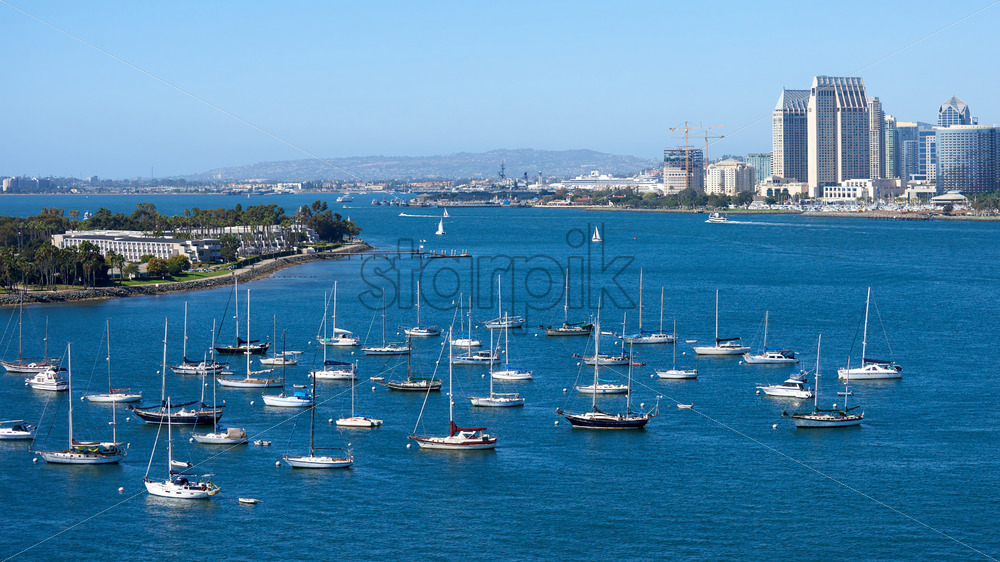 Sailing boats in waterfront area. Cityscape on background. San Diego, California