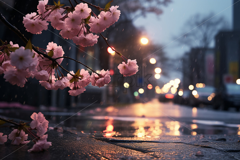 Caucasian woman in blue dress touching pink tree flowers in Barcelona, Spain
