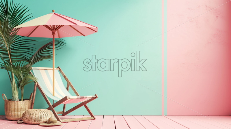 Sale banner with deck chair with umbrella and beach accessories on pastel background