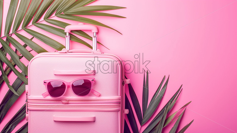 Sale banner with suitcase, sunglasses and palm leaves on pink background