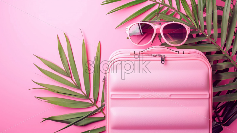 Sale banner with suitcase, sunglasses and palm leaves on pink background