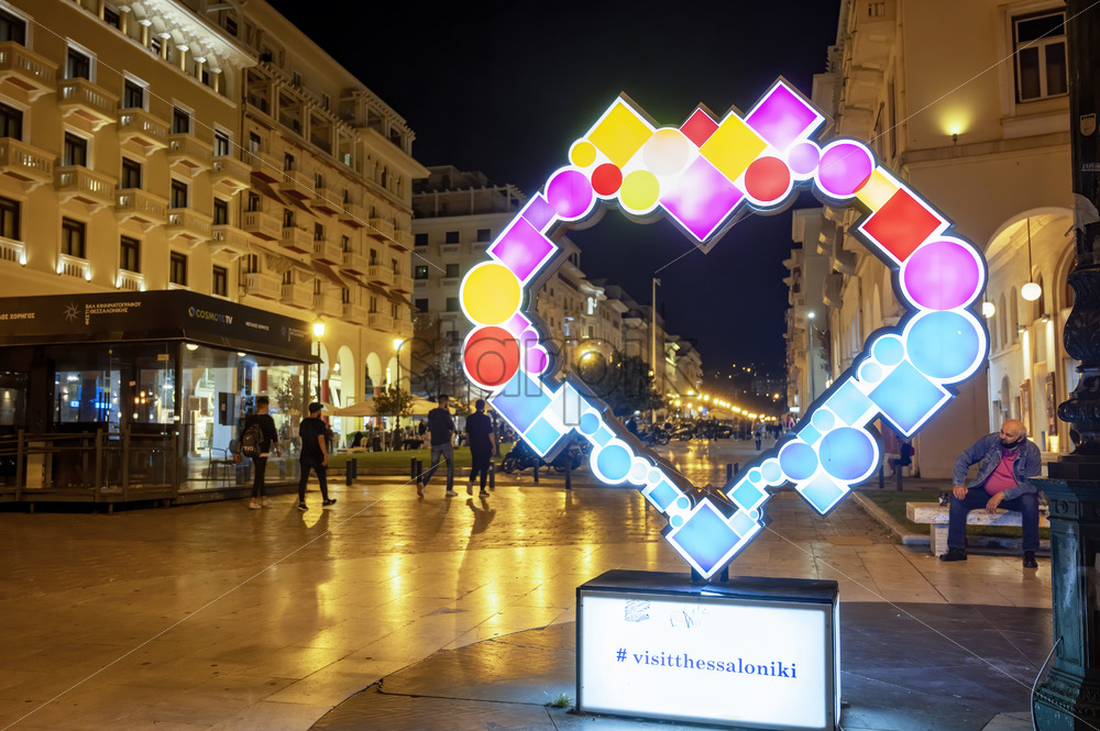 SALONIKI, GREECE – OCTOBER 26, 2020: Art glowing installation located in the city center at night, a lot of walking people and buildings