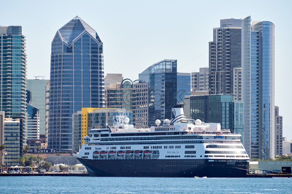SAN DIEGO, CALIFORNIA – OCTOBER 1, 2019: City close up with telephoto lens with parked cruise liner