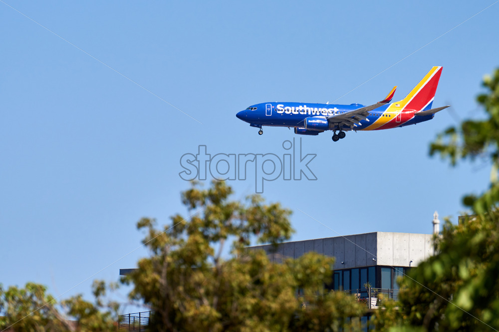 SAN DIEGO, CALIFORNIA – OCTOBER 1, 2019: Southwest airplane flying above the city. Preparing to land
