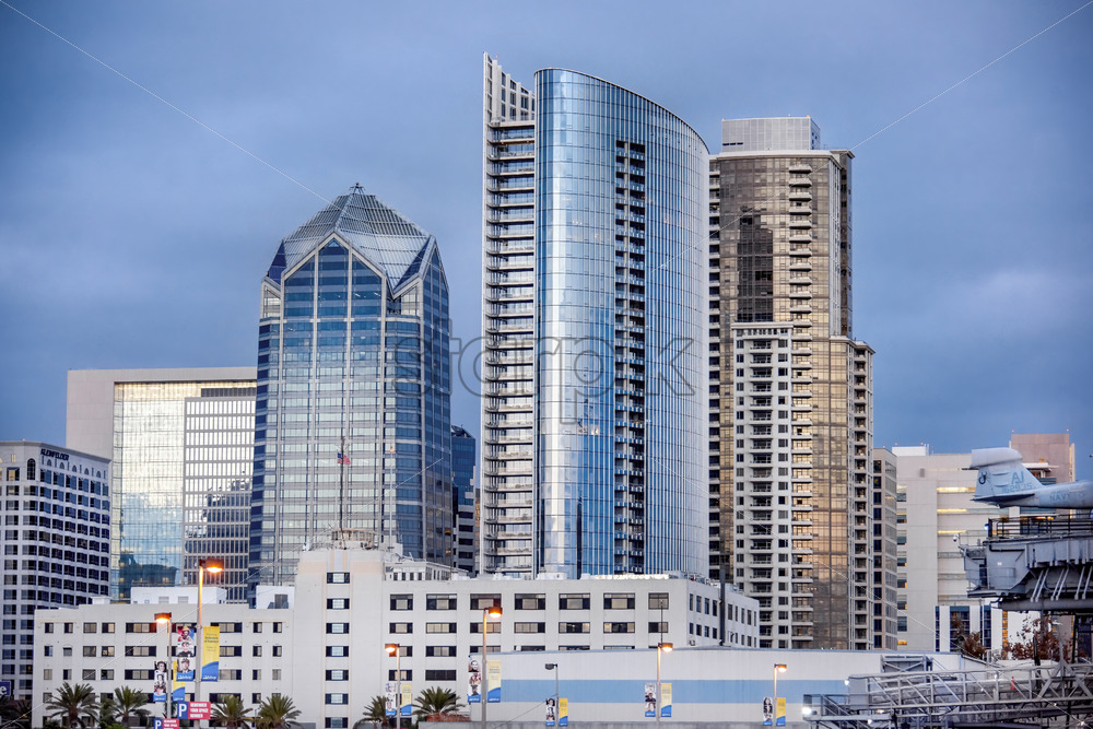 SAN DIEGO, USA – SEPTEMBER 27, 2019: High and modern buildings with glass facades at dusk