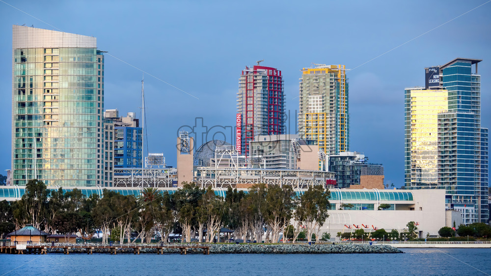 SAN DIEGO, USA – SEPTEMBER 27, 2019: High and modern buildings with park zone and Pacific ocean on the foreground
