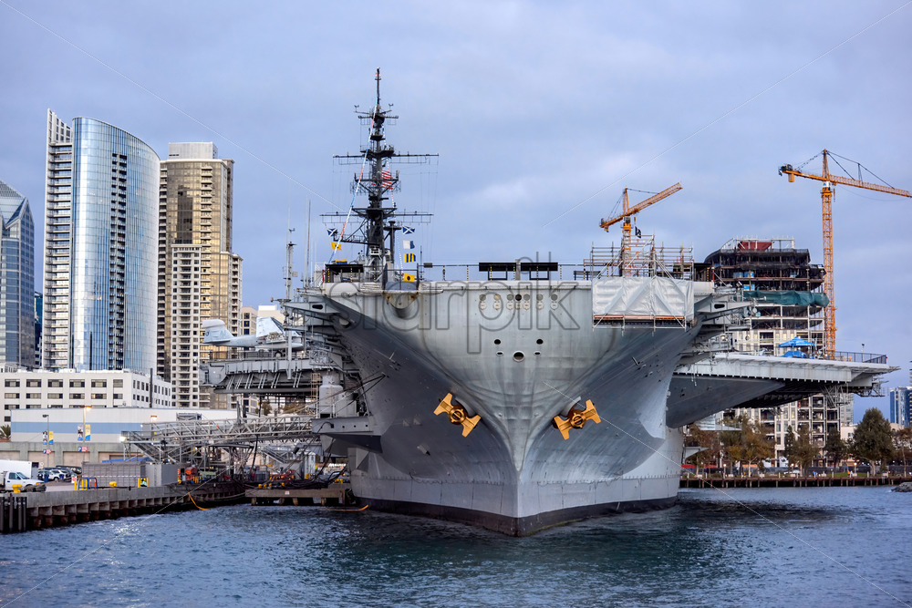 SAN DIEGO, USA – SEPTEMBER 27, 2019: Moored warship aircraft carrier with modern buildings and construction works on the background