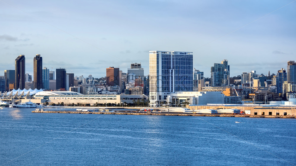 SAN DIEGO, USA – SEPTEMBER 27, 2019: View of the city, seaport, modern buildings, Pacific ocean on the foreground