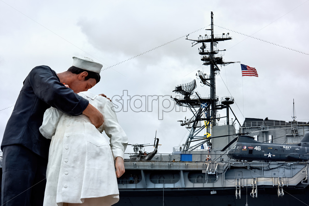 SAN DIEGO, USA – SEPTEMBER 28, 2019: The Kissing Sailor Statue with military helicopters on the background