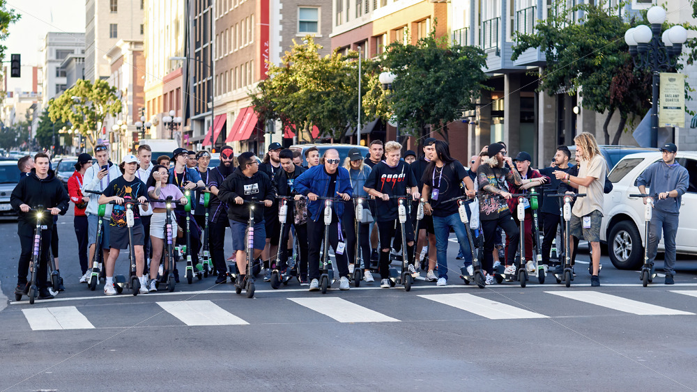 SAN DIEGO, USA – SEPTEMBER 29, 2019: Group of people on scooters waiting on a pedestrian crossing