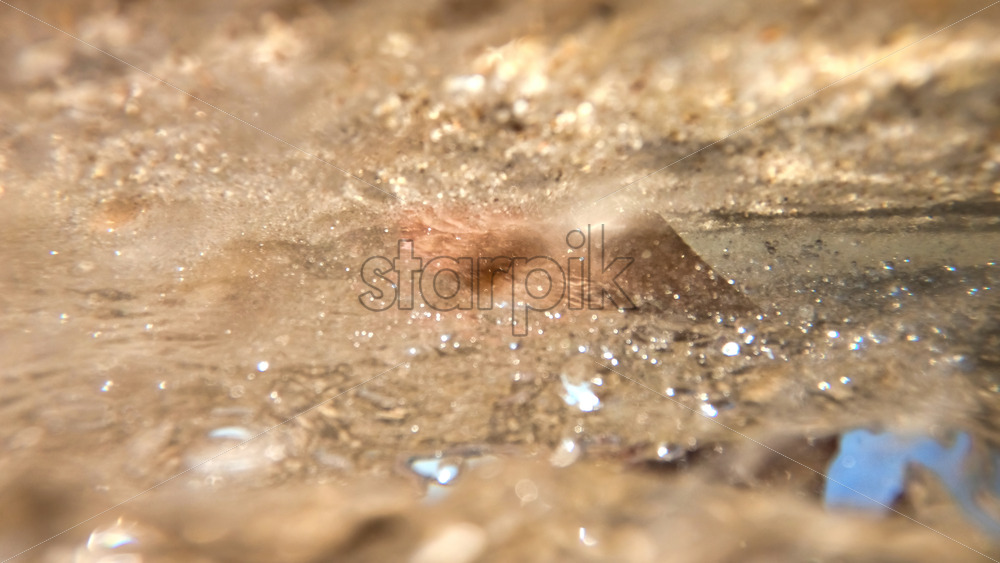 Beach on Aegean sea coast with closed umbrellas and sunbeds, rocks in the water, embankment street, sea port and green hills in the distance in Nikiti, Greece. Slow motion Royalty Free Stock Video Footage