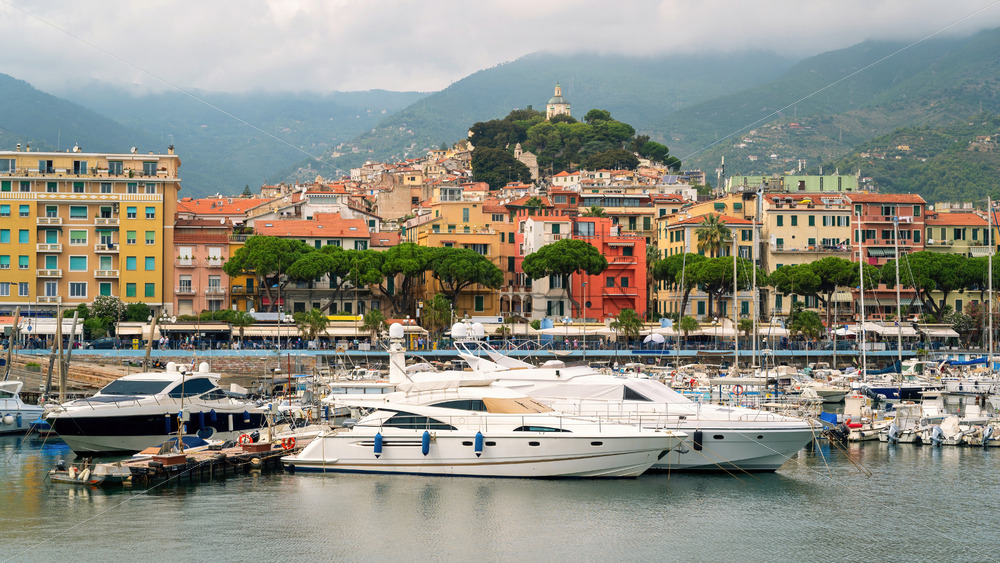 SANREMO, ITALY – SEPTEMBER 14, 2021: View of the sea port and city. Moored boats and yachts, buildings and greenery, hills on the background