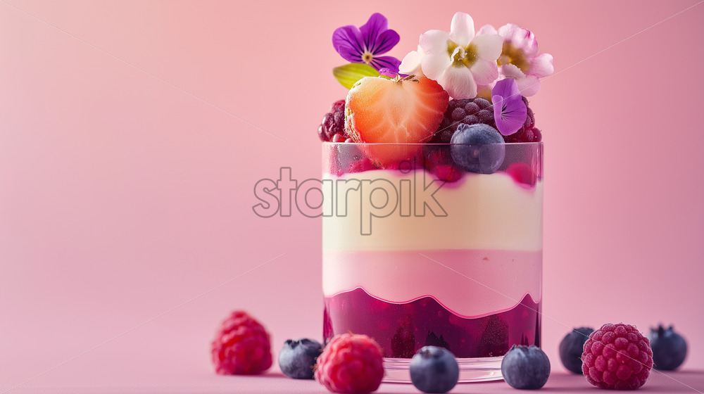 Elegant dessert in a glass topped with fresh strawberries, blueberries, and a chocolate lattice decoration Royalty Free Stock Video Footage