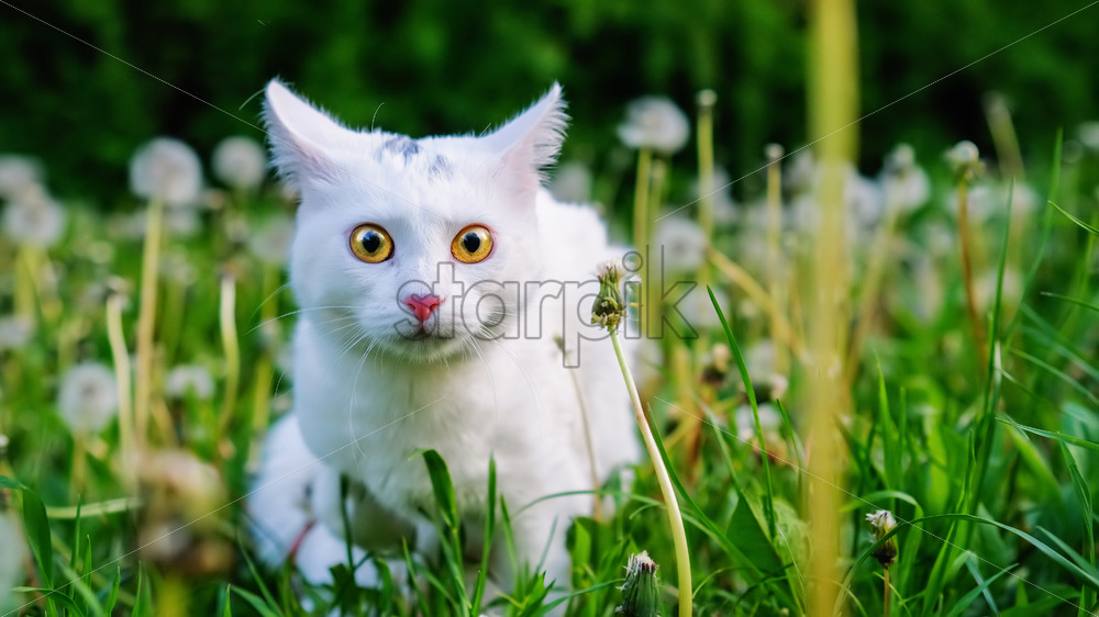 Scared white cat looking afraid at the camera in a green lawn full of dandelions
