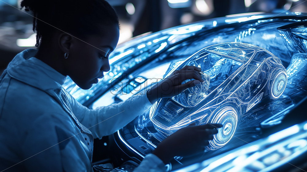 Home » Shop » AI Illustration » scientist designing a futuristic vehicle in the quantum metaverse