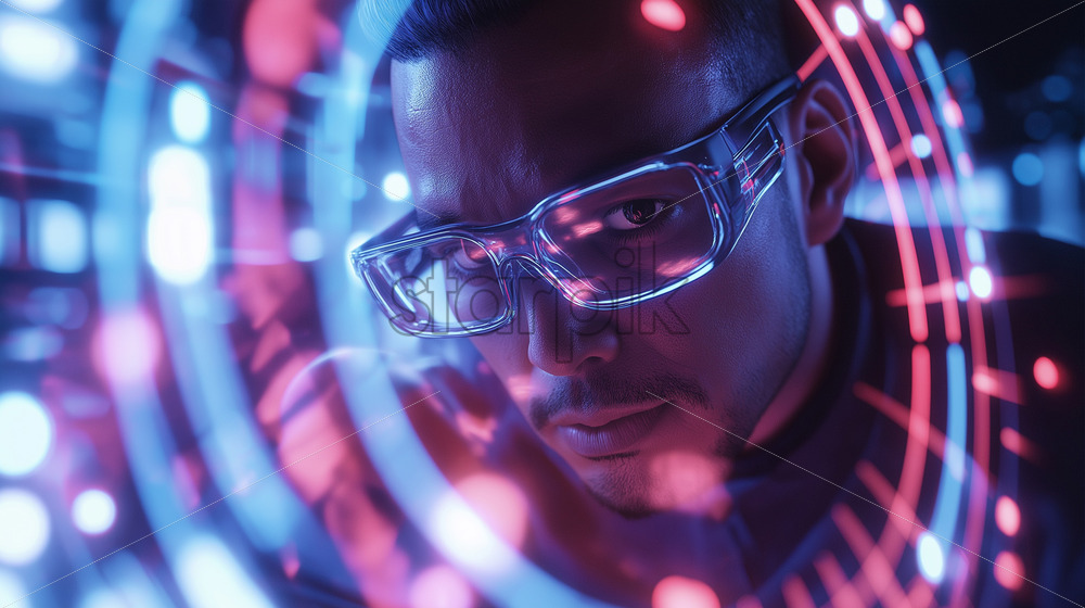 scientist sitting in front of holographic projections, analyzing an encoded space signal