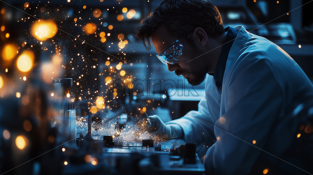 scientist sitting in front of holographic projections, analyzing an encoded space signal
