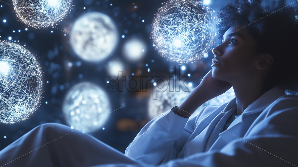scientist sitting in front of holographic projections, analyzing an encoded space signal