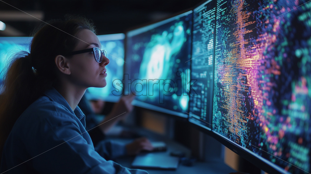 scientist sitting in front of holographic projections, analyzing an encoded space signal