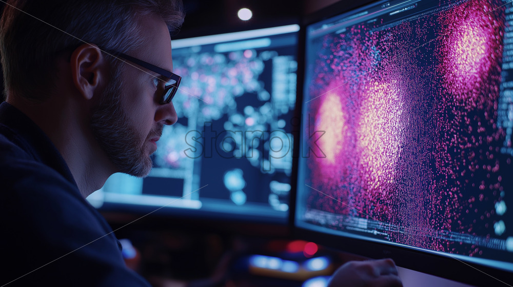 Home » Shop » AI Illustration » scientist sitting in front of holographic projections, analyzing an encoded space signal