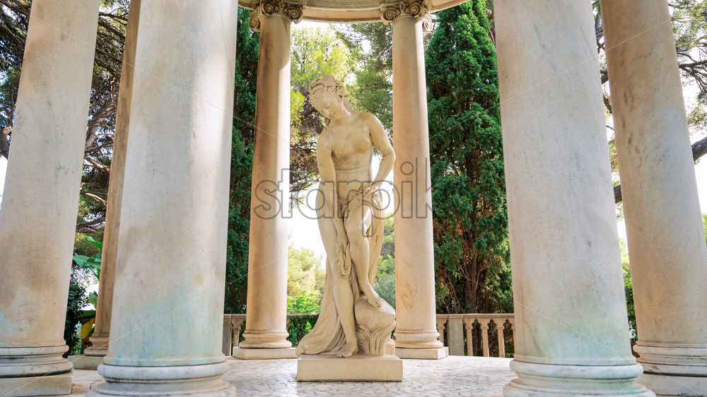 View of a gazebo with sculpture in a garden of the Villa Ephrussi de Rothschild in Saint-Jean-Cap-Ferrat, France
