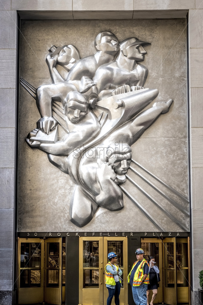 NEW YORK, USA – SEPTEMBER, 2019: Sculptures above the entrance to Rockefeller Center made in empire style in downtown