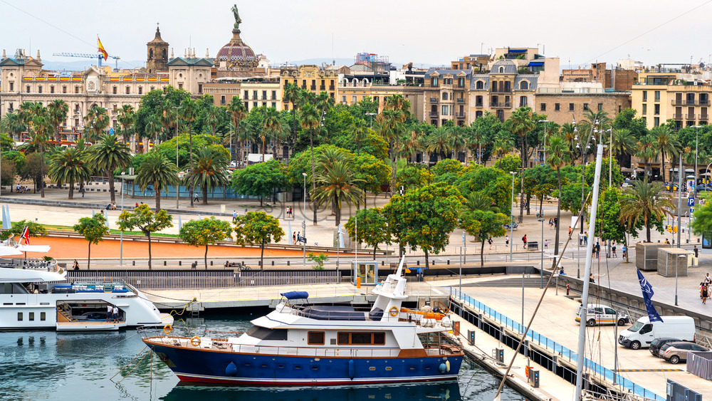 Moored boats in the Mediterranean sea port, buildings, embankment street, greenery in Barcelona, Spain