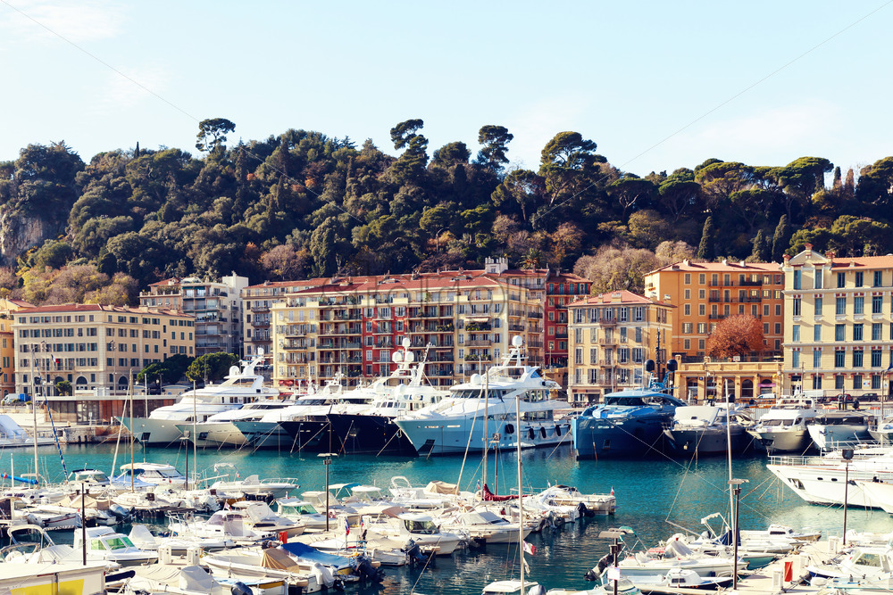 Beautiful daylight view from top of mountains to luxury resort villefranche sur mer and bay on french riviera at mediterranean sea Cote d’Azur in France, beach with boats cruising on water.