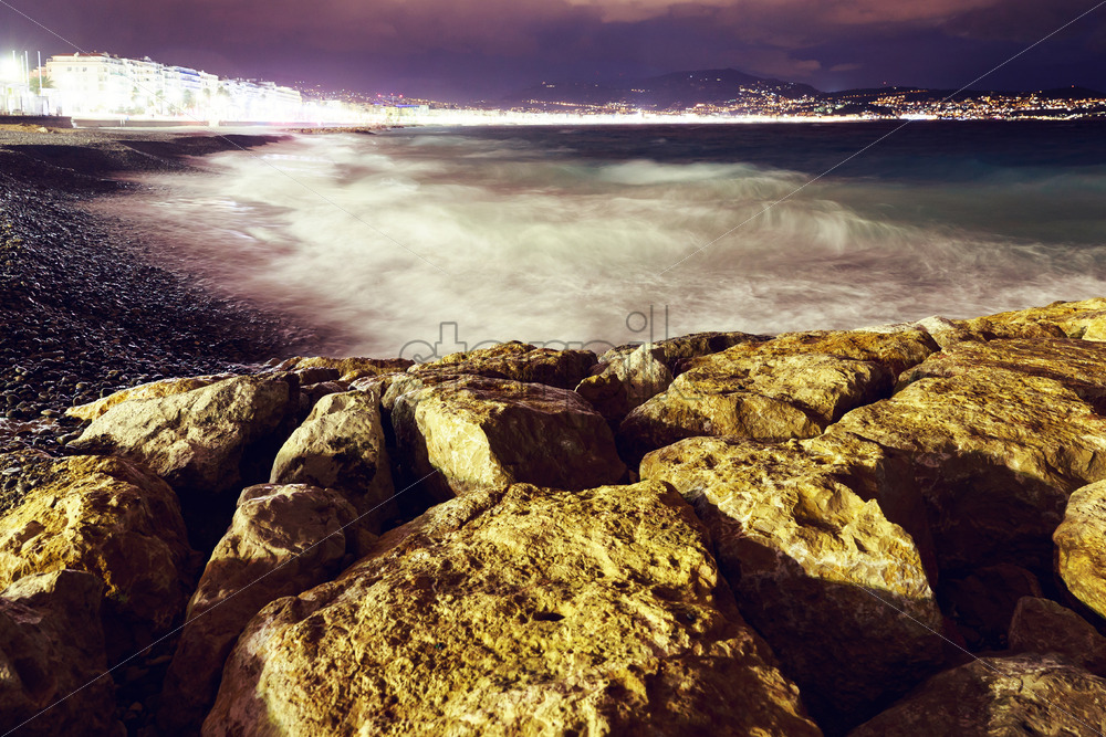 Clear sea shore with rocks and green and blue waters in Nice, France