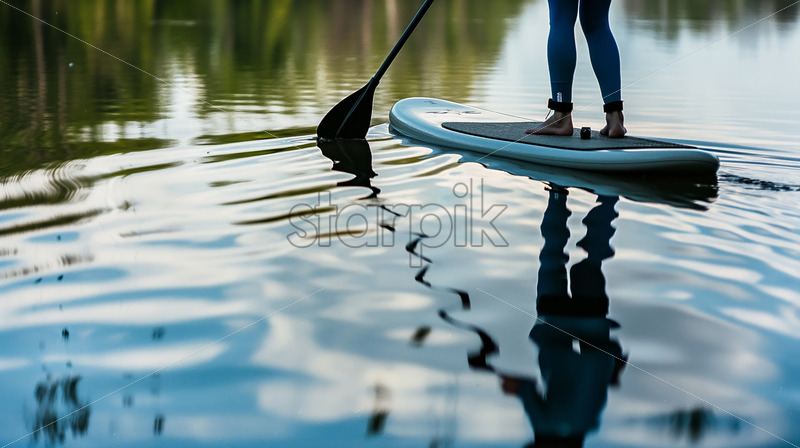 A close photo of a person peacefully paddleboarding on a tranquil lake or river, with reflections of nature shimmering on the water’s surface.