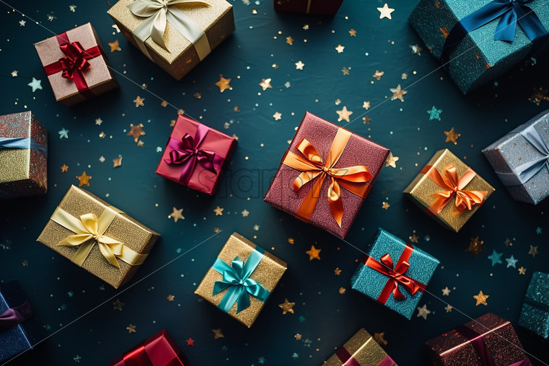Several colorful gifts on blue background