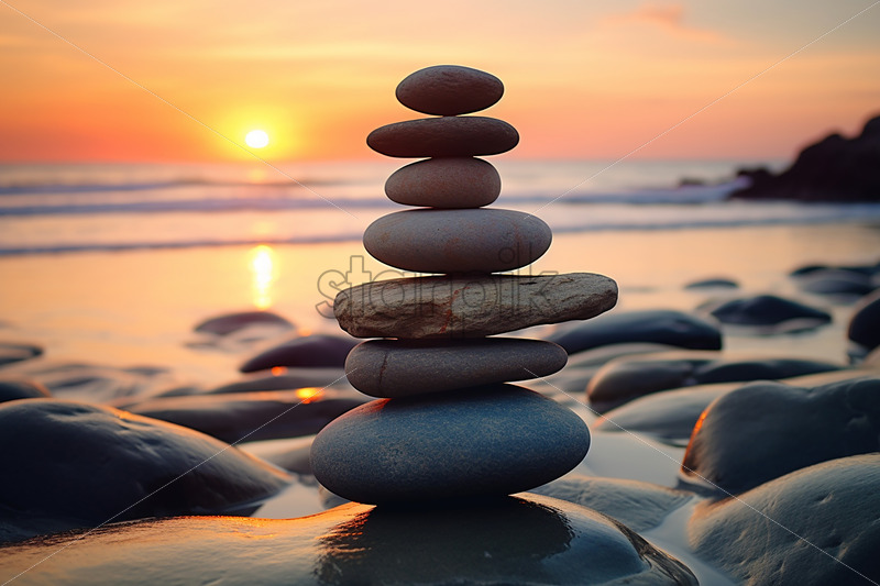 Home » Shop » AI Illustration » Several stones arranged one above the other on the shore of a lake