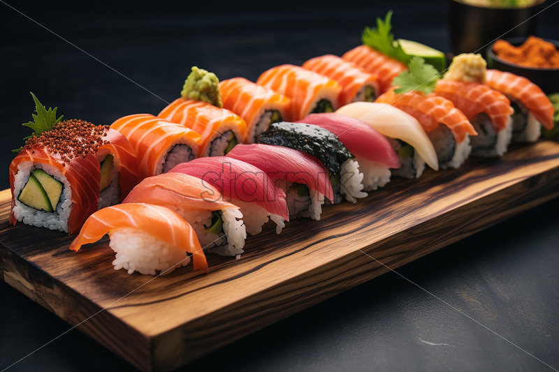Close up of sushi rolls on wooden trays at a restaurant Royalty Free Stock Video Footage