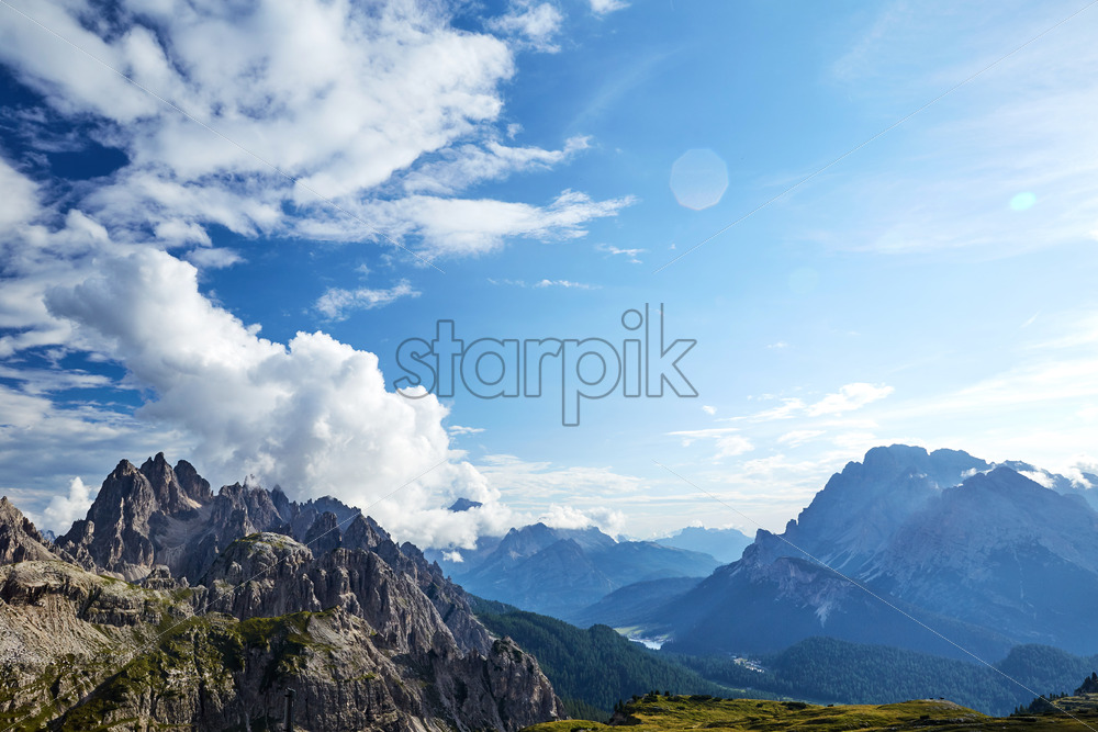 Sexten Dolomites mountains near Tre Cime di Lavaredo. Cloudy ski on background. Italy beauties